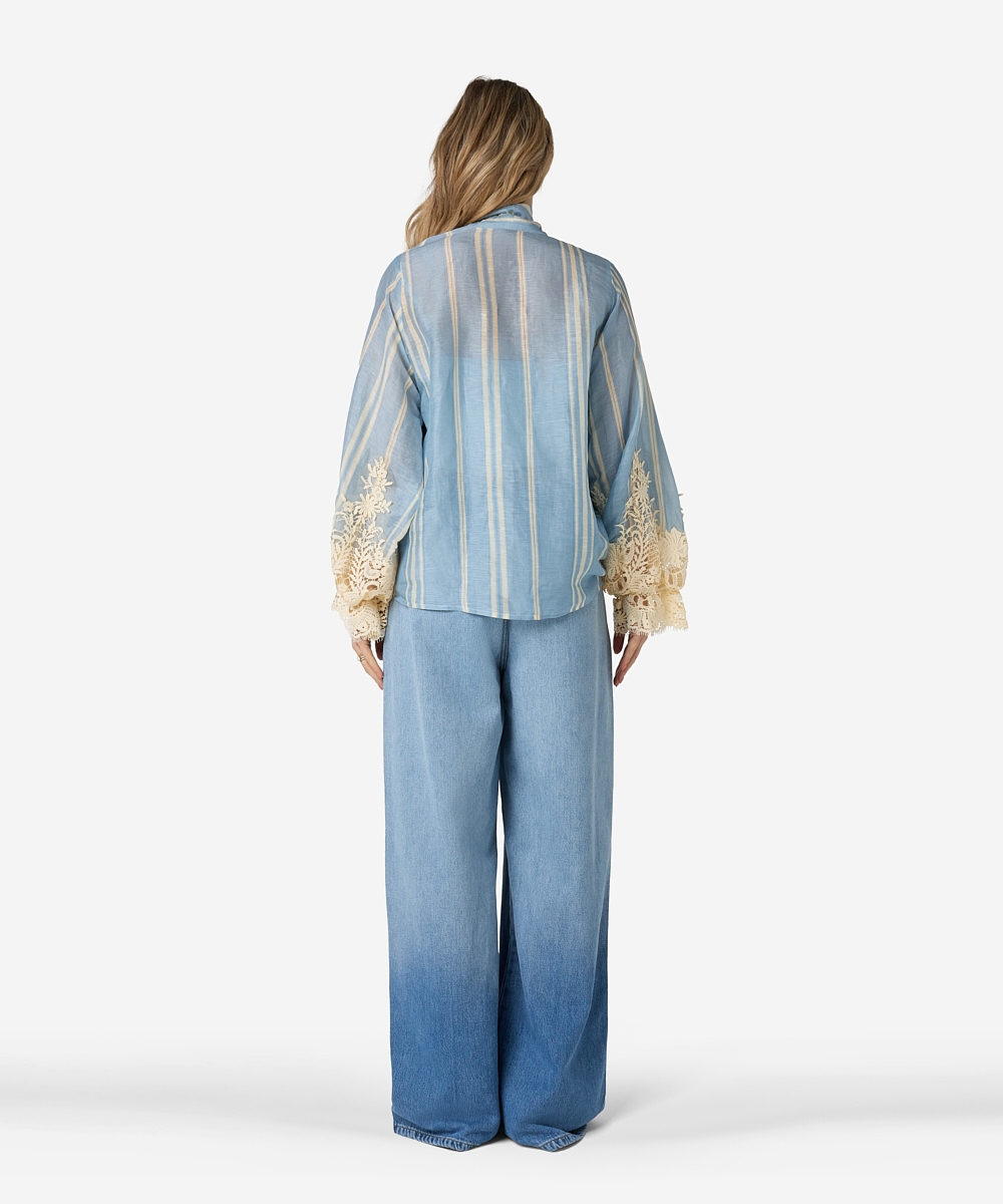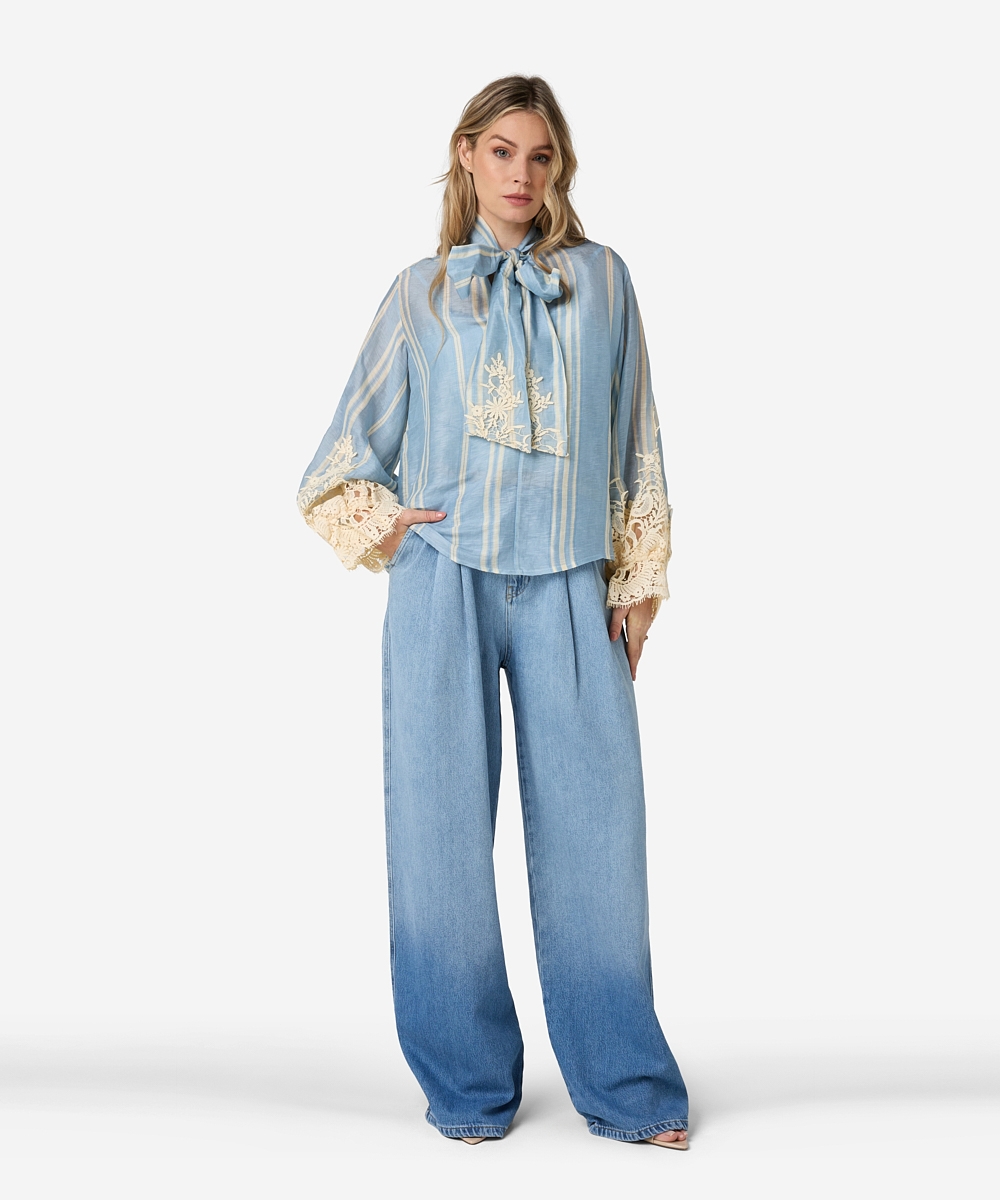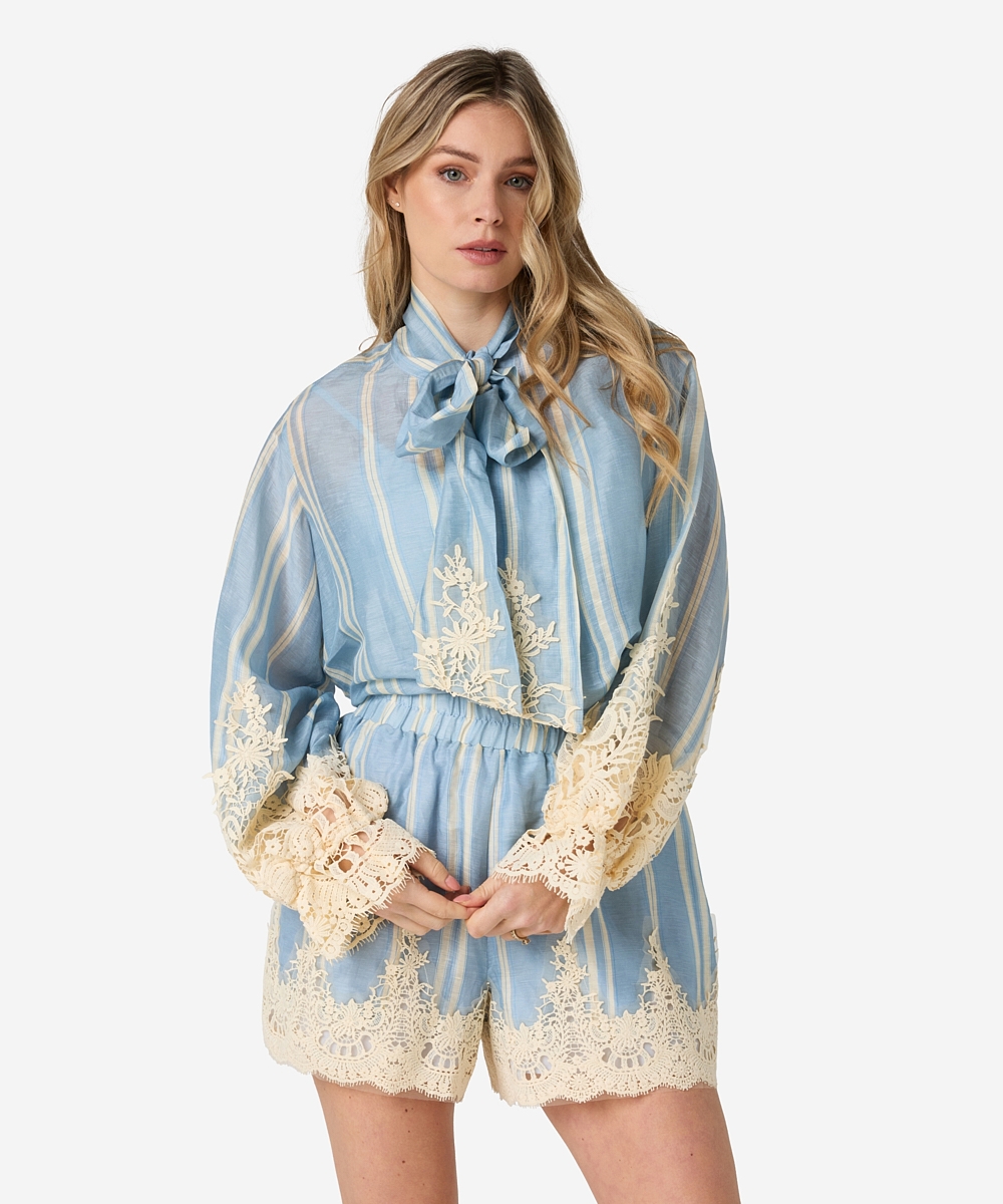 De Tivina top in de kleur Blu Lato is een luchtig en vrouwelijk item met speelse details. Deze top is gemaakt van 100% linnen, heeft een wijde fit, v-hals en subtiele beige streepjes voor een zomerse uitstraling. De mouwen zijn afgewerkt met een verfijnd embroidery patroon en in de nek zit een strikdetail dat zorgt voor een charmant accent. Combineer de Tivina top met de Pristina pants voor een stoere, vrouwelijke look of ga voor de bijpassende shorts voor de ultieme zomeroutfit.