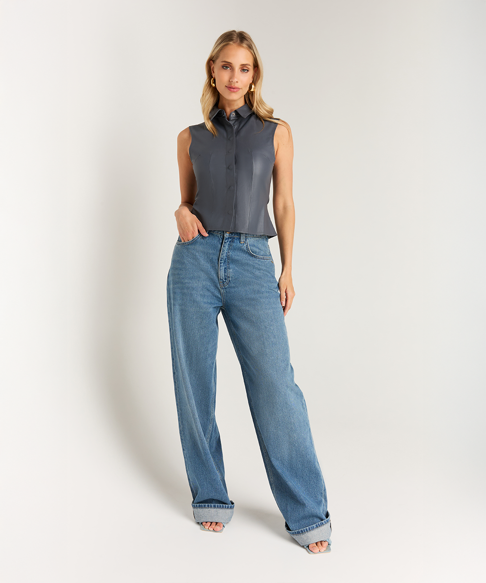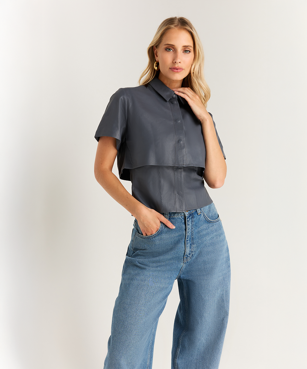 De Baylin cape-blouse in de kleur Azur Grey is luxe blouse met veel mogelijkheden. De blouse is gemaakt van hoogwaardig kwaliteitsleer, heeft een kraag en heeft een getailleerde pasvorm. Bij de kraag zit een onzichtbare rits waardoor je de cape eraf kunt ritsen. Hierdoor ontstaat een getailleerde mouwloze top met kraag. Draag de Baylin blouse met de Paylin suede pants voor een afgestijlde ton-sur-ton look.