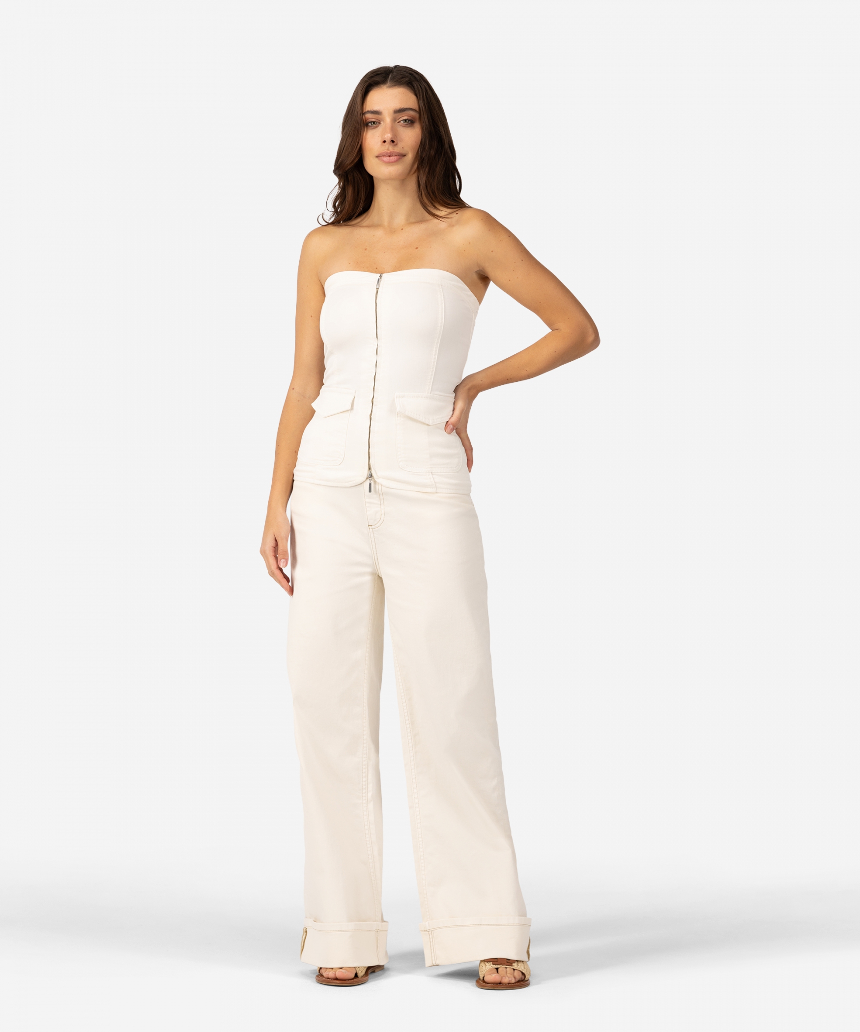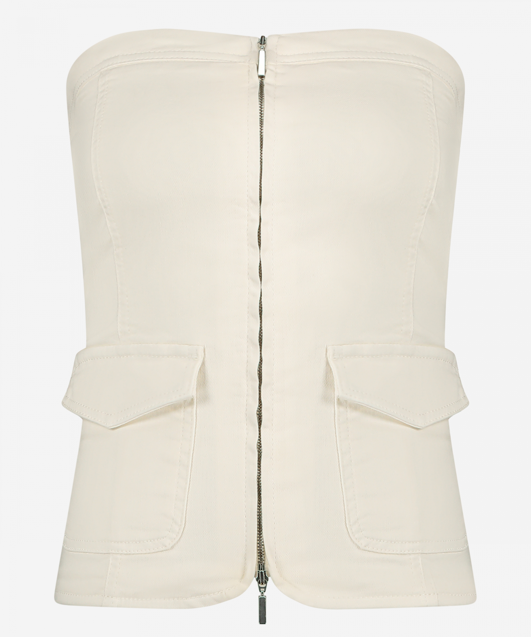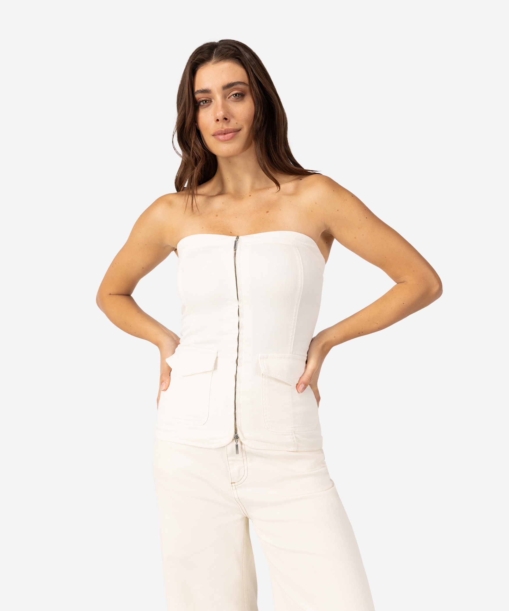 Maak kennis met onze strapless Tuomo Top in de kleur Blanco. Deze 100% katoenen denim top is de perfecte top voor de lente en zomer. Door middel van een rits aan de voorkant kan de Tuomo makkelijk aan- en uitgetrokken worden. Doordat de top veel stretch heeft sluit hij prachtig aan! Draag deze top met de bijpassende Portia broek voor een fashionable look.| Buitenzakken: | Meerdere zakken |